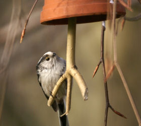 | Materialien | unglasierte Tontöpfe, ca. 8 cm Durchmesser, mit Loch im Boden; Kordel oder dünnes Hanfseil; circa 4 cm kurze, stabile Stöckchen; circa 20-25 cm lange dünne Äste; Fettstange; Haferflocken (kernig/Vollkorn), Sonnenblumenkerne (geschält oder mit Schale), Hanfkörner, Nussbruch/Nusskerne, Weizenkleie, Sämereien etc.; ungeschwefelte Rosinen; großer Topf; langstieliger (Holz-)Löffel; je 100 g Fett auf circa 100 g Beigaben (Körner, Rosinen, Nüsse et cetera)